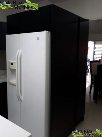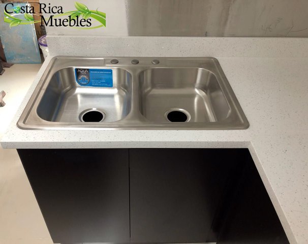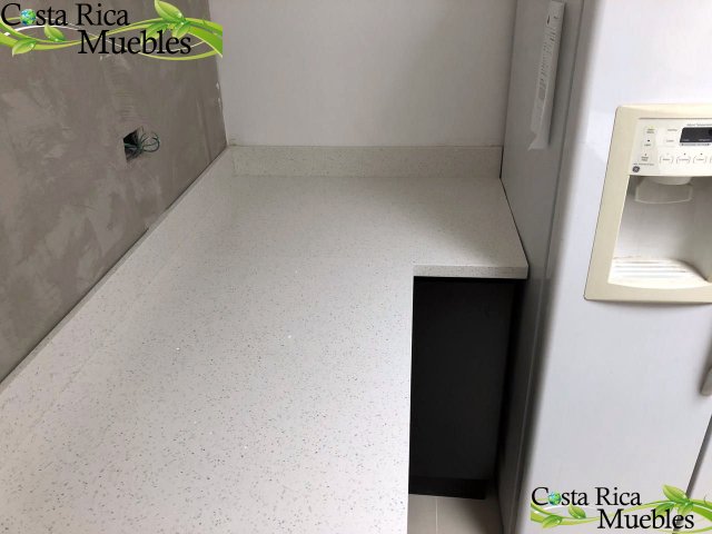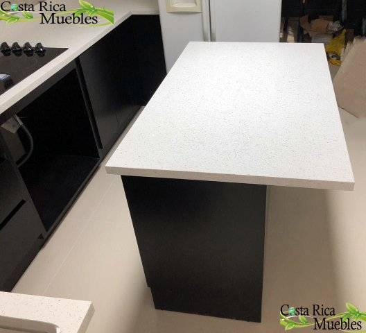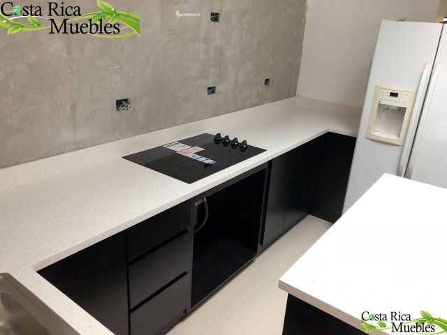 En costaricamuebles.com nos complace compartir otro proyecto de mueble de cocina entregado según especificaciones y diseño acordado a gusto del cliente. Estructura y puertas: Madera con acabado poliuretano tono Nogal Oscuro. Rieles telescópicos con cierre suave para las gavetas y puertas. Sobre Cuarzo Blanco Estelar