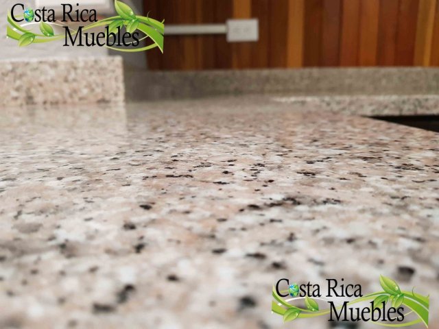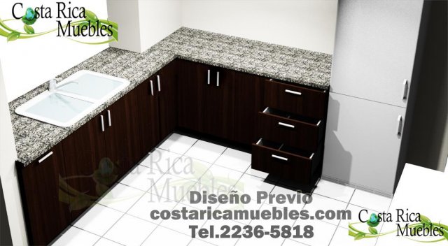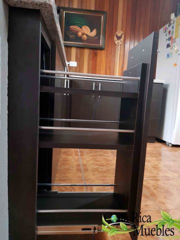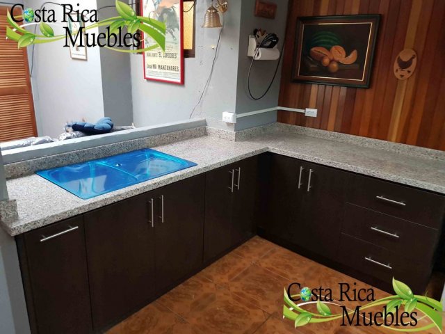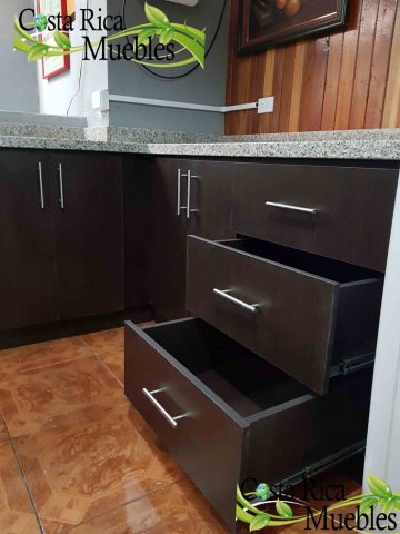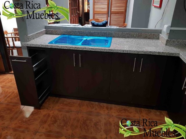 Mueble Base de cocina melamina Resistente Humedad tono Chocolate. Incluye herraje Especiero. Rieles telescópicos para las gavetas con cierre lento y tiraderas cilíndricas rellenas. El tipo de sobre Granito Natural tono Crema Julia, fregadero acero inox.